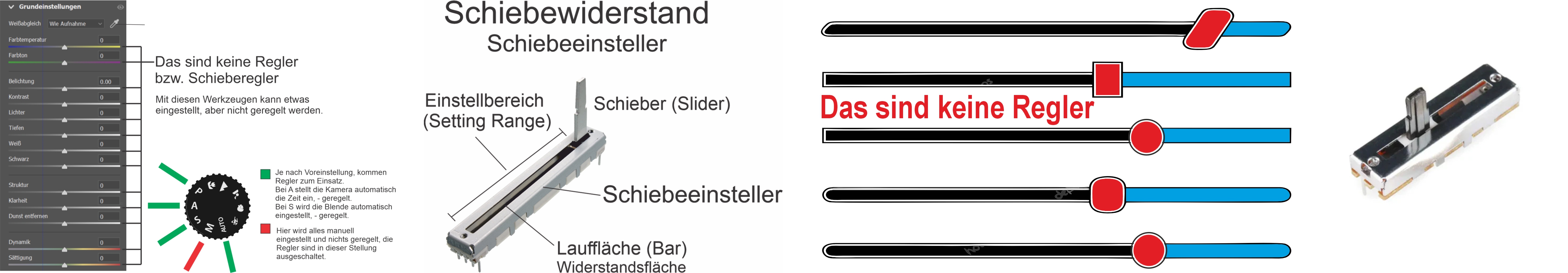 Wenn in Bildbearbeitungsprogrammen (Adobe, Microsoft und viele andere) von Schieberegler gesprochen wird, ist das immer noch mit einem Schiebepotentiometer zu vergleichen, diese sogenannten "Schiebereglern" haben keine regelnde Funktion sondern eine einstellende Funktion.